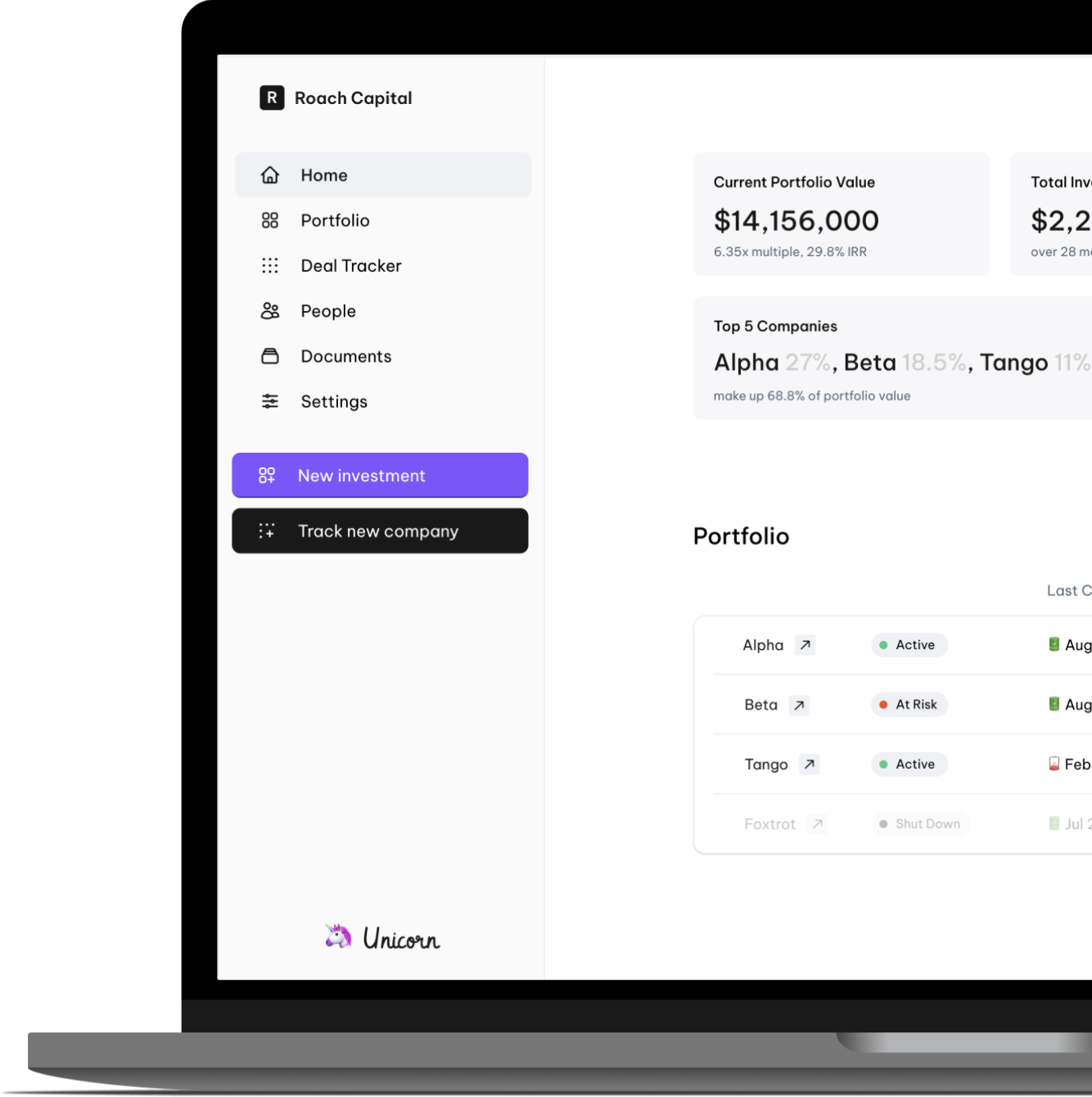 Unicorn helps VCs and angel investors manage their portfolio. Keep a timeline of updates, manage documents, annotate, search, and more.
